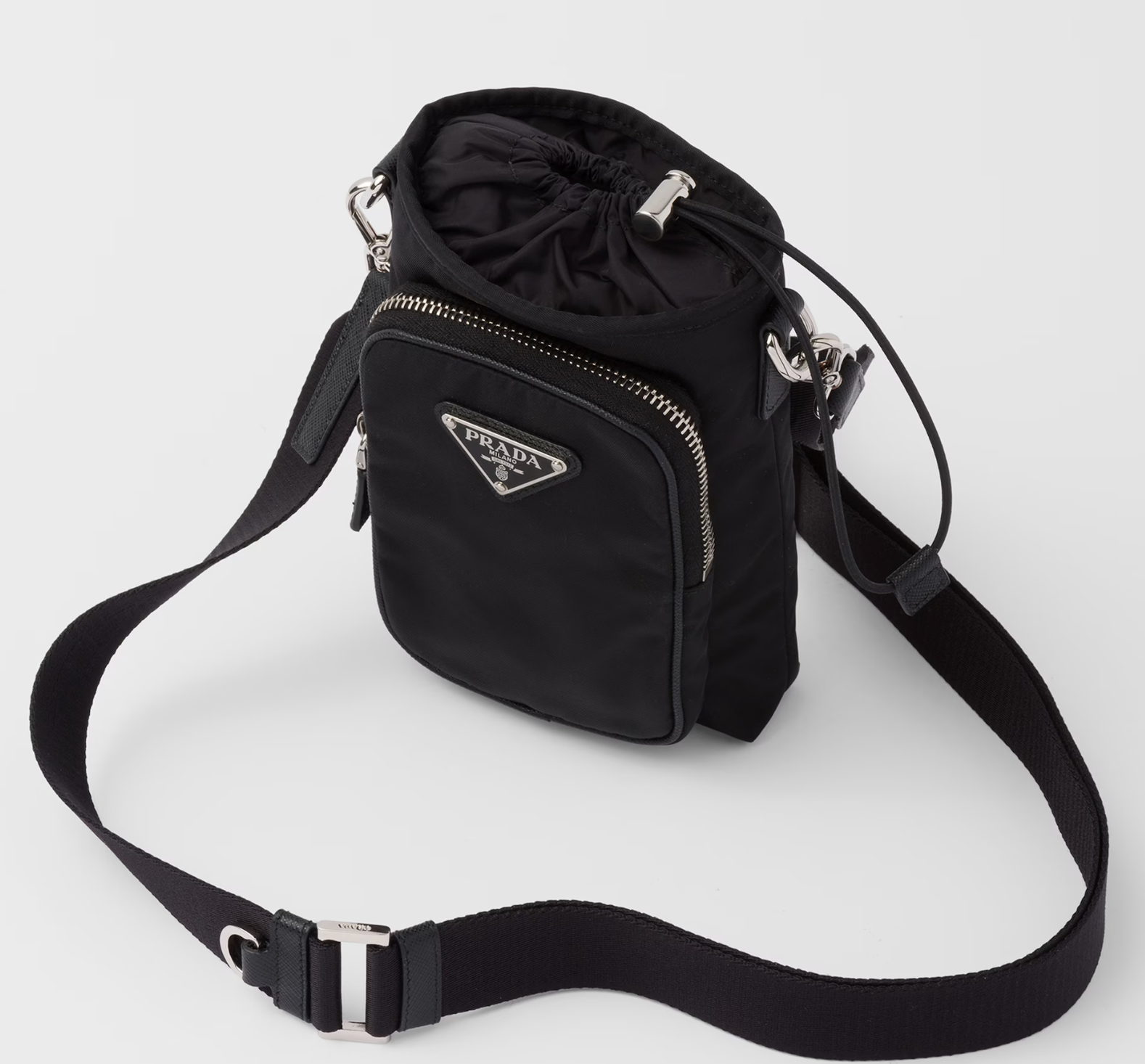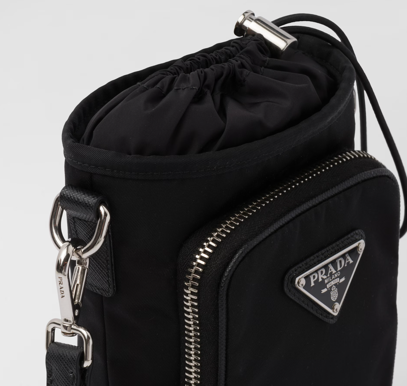 This smartphone case made of innovative Re-Nylon expresses a modern, urban character. The accessory is distinguished by the adjustable woven nylon tape shoulder strap and drawstring closure. The front is decorated with the iconic enameled metal triangle logo.
