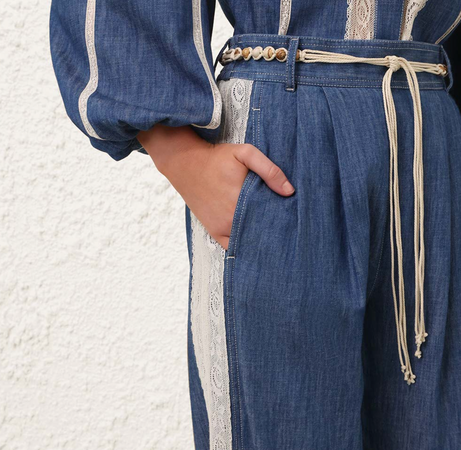 The Awaken Denim Harem Pant in Railway Blue from our Resort Swim 2026 Collection. A denim harem pant featuring a shirred waistband at centre back, removable macrame waist belt, finished with lace panelling on the sides and bow-tie ankle cuffs.