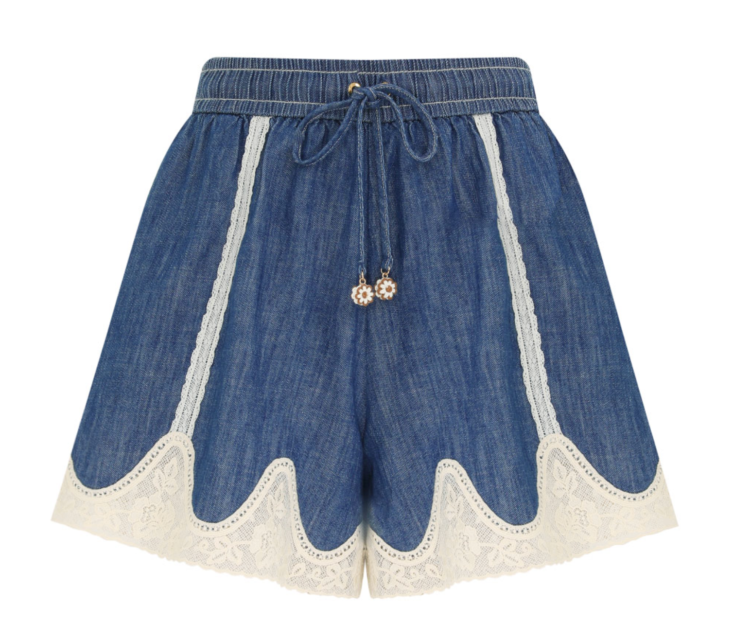 The Awaken Denim Short in Railway Blue from our Resort Swim 2026 Collection. A denim short featuring an elasticated waistband, self-rouleau tie and lace detailing throughout.